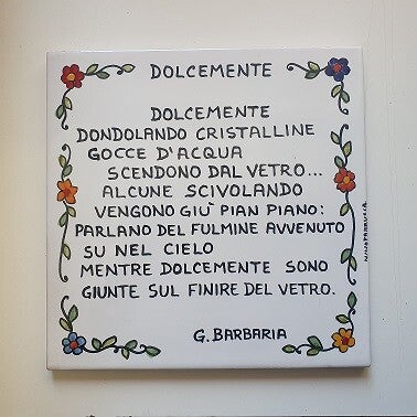 Ho pensato che l'arte in versi racchiusa all'interno di apprezzabili decorazioni fatte a mano su mattonelle realizzate in ceramica, può rappresentare un "particolare oggetto da arredo" per la casa e per gli spazi esterni. Potrei definirlo per alcuni aspetti "originale", di certo è un elemento che non passa inosservato, suscita al primo impatto curiosità ed ammirazione, seguirà poi una vera immersione nell'arte creativa e visibile.